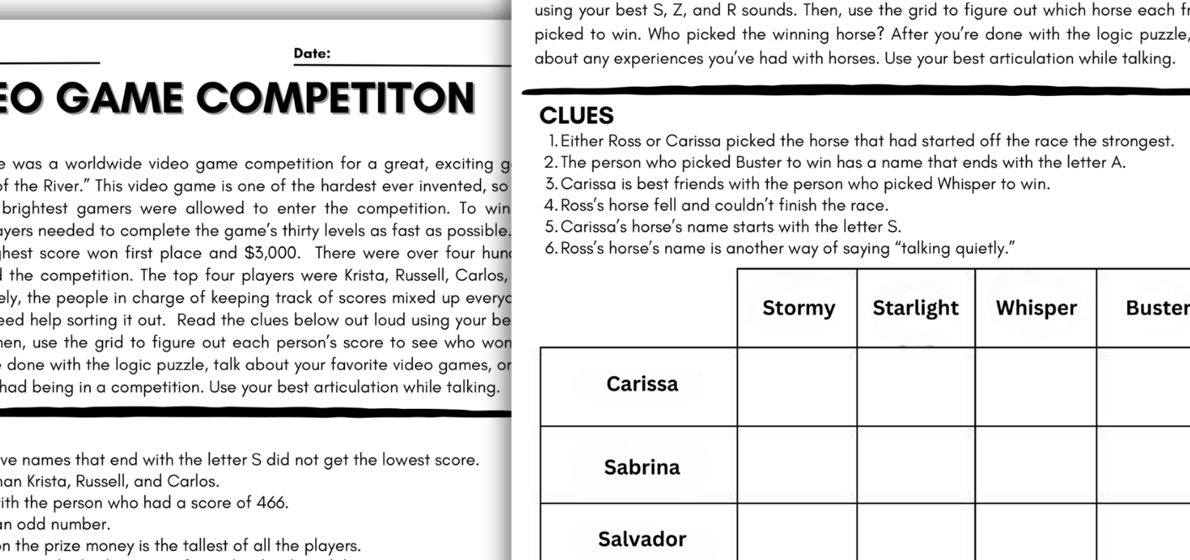 My middle school students absolutely love logic puzzles, and they’re one of the easiest ways to keep older students engaged in therapy. These types of activities feel more like brain challenges than traditional speech work, which can be especially motivating for students who are starting to feel “too old” for typical speech materials. Logic puzzles are also a great fit for students who are working on language or executive functioning skills, since they require careful listening, problem-solving, and attention to detail.